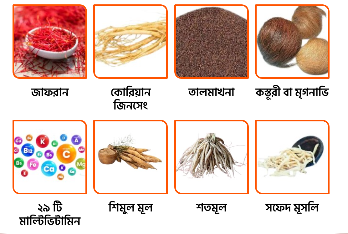 Natural Power Source রয়েছে মাল্টিভিটামিন এর ৪৯টি উপাদান আছে জিনসিং, আলকুশি, সাফেদ মুসলি, পানিফল, শিমুল মূল, শতমূল, তালমাখনা, মাশরুম, আখরোট, আফ্রিকান খুসিলা, কস্তুরী এর মতো মহামূল্যবান বহু উপাদান